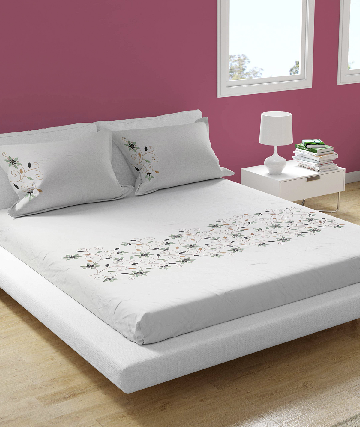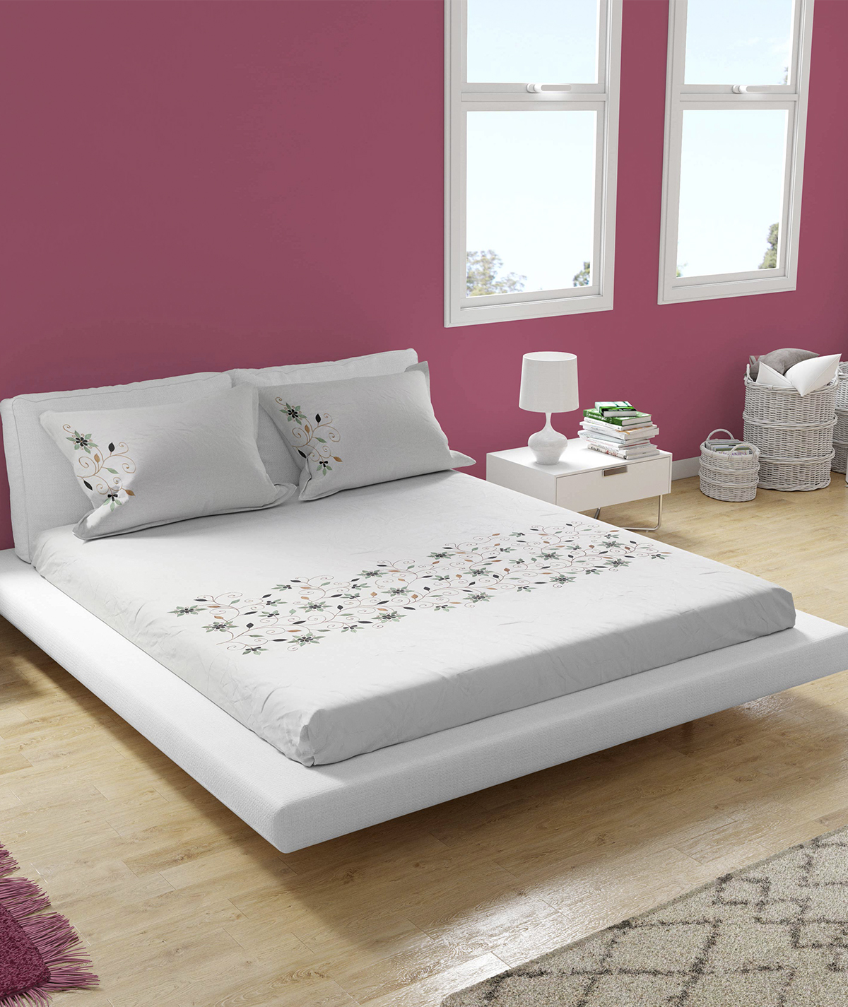 grey cotton bedsheet king size, embroidered floral cotton bedsheet, light grey bedsheet with pillow covers, elegant bedding for modern homes, breathable cotton bedsheet India, floral embroidery bedsheet set