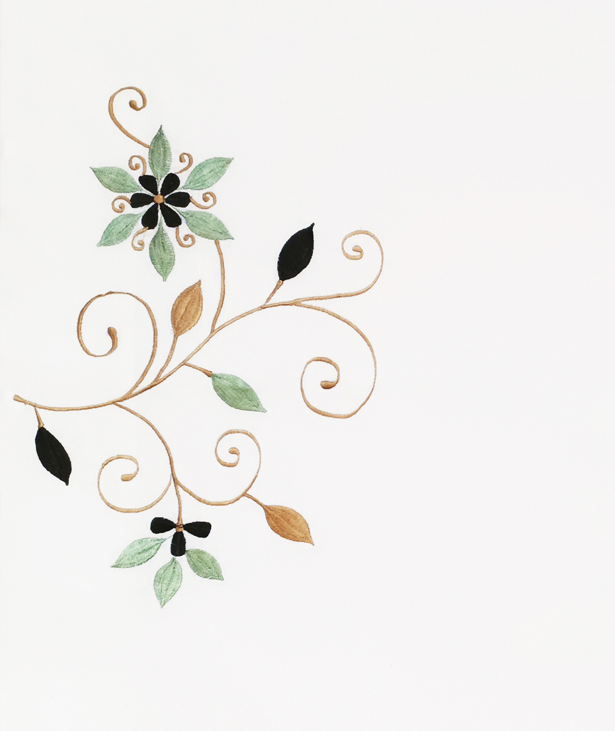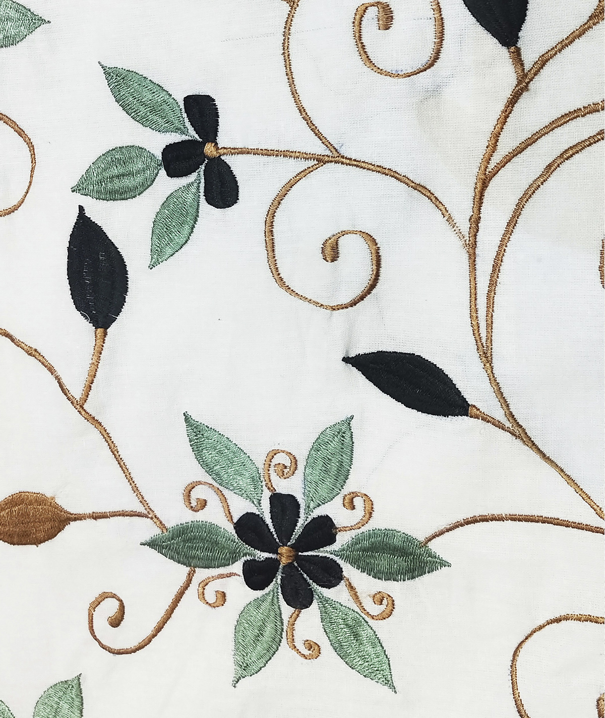 Subtle Floral Embroidery: Delicate floral vines in white, peach, and green tones