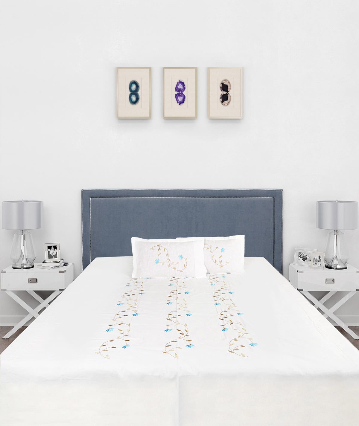 This bedsheet set offers a harmonious blend of comfort, craftsmanship, and understated style. The cool tones and delicate embroidery elevate the look of any room without overpowering the design.