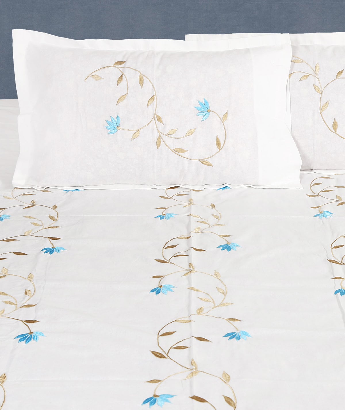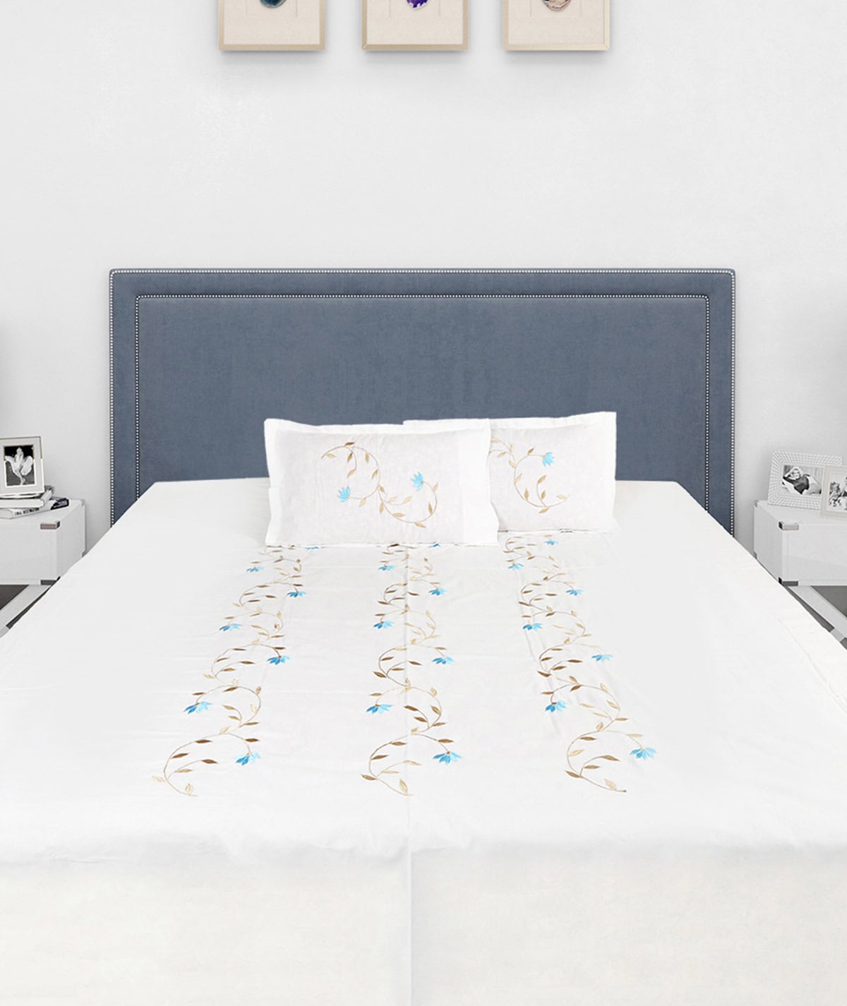 Refresh your bedroom with the soothing elegance of our White Cotton Bedsheet Set with Blue and Brown Floral Embroidery. Crafted from high-quality, breathable cotton, this bedsheet features vertical vine-style embroidery in soft blue and earthy brown tones — a perfect match for modern, rustic, or minimal décor.